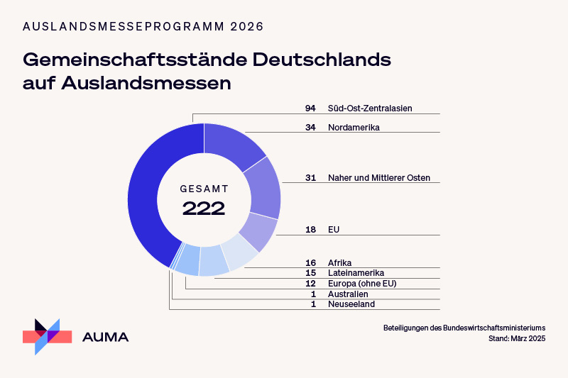 In Summe werden kleine und mittelständische deutsche Unternehmen im kommenden Jahr auf über 220 Messen in 45 Ländern vom Bundeswirtschaftsministerium unterstützt. Die Länder Süd-Ost- und Zentral-Asiens bleiben wie schon in den vergangenen Jahren mit knapp 95 Messeförderungen an der Spitze. Wichtigstes Förderland werden wie 2025 die USA mit 32 Beteiligungen. China und die Vereinigten Arabischen Emirate folgen mit 27 und 23 Gemeinschaftsständen, den sogenannten German Pavilions, sowie Indien mit 19 und Singapur mit zehn Messen. Als Dachverband der deutschen Messewirtschaft koordiniert der AUMA das Programm für die ausstellende deutsche Wirtschaft.