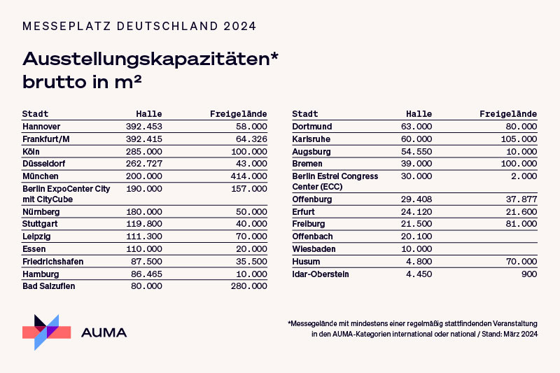 Die Erhöhung ist auf die Eröffnung der neu aufgebauten Halle 5 bei der Messe Frankfurt zurückzuführen. Außerdem ist das Estrel Congress Center ECC in Berlin hinzugekommen, in dem zwei internationale Messen stattfinden. Messe- und Ausstellungsplätze mit regionaler Bedeutung verfügen zusätzlich über eine Bruttohallenfläche von rund 380.000 Quadratmeter. Damit stehen derzeit in Deutschland über 3,2 Millionen Quadratmeter Hallenfläche zur Durchführung von Messen zur Verfügung – eine Fläche so groß wie 448 Fußballfelder. In diesem Jahr sind Erweiterungen der Messegelände in größerem Umfang nicht vorgesehen.