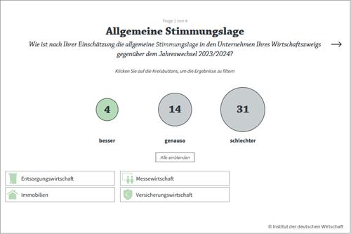 Die Messewirtschaft gehört zu den wenigen Branchen in Deutschland, die positiv auf das neue Jahr schauen. Die Stimmung in den allermeisten Branchen ist aber schlechter, geht aus einer Umfrage des Instituts der deutschen Wirtschaft hervor.