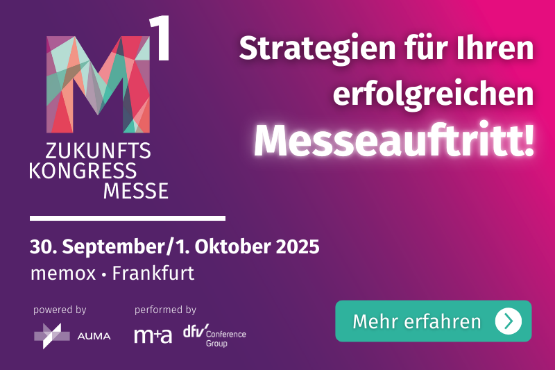 Berlin, 10. März 2025 | In Zusammenarbeit mit dem Verband der deutschen Messewirtschaft AUMA lancieren die dfv Conference Group und der m+a report, beide dfv Mediengruppe, ein neues Eventformat: M1 – Zukunftskongress Messe. Der Kongress richtet sich vorrangig an ausstellende Unternehmen, die Messen als strategisches Marketing-Instrument nutzen und sich damit weiterentwickeln wollen.